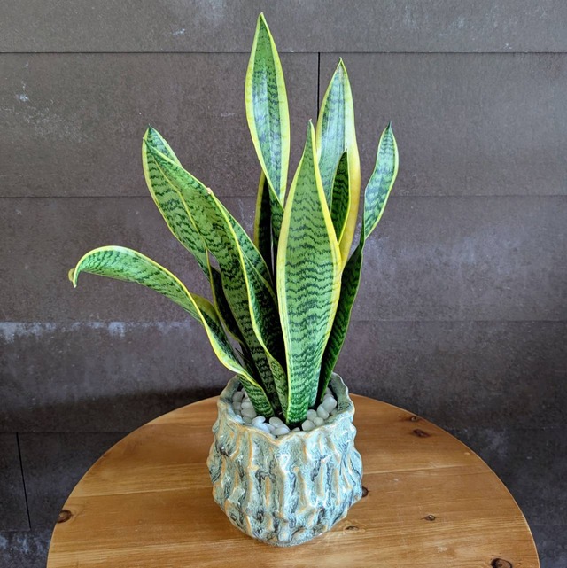 【サンスベリア・ローレンチ】 –揺るがない、美しさ– すっと上に伸びるシャープな葉と、緑に入るイエローラインが印象的なサンスベリア・ローレンチ。 サンスベリアは「空気をきれいにする植物」としても知られ、インテリア性と機能性を兼ね備えた人気の観葉植物。 ただそこにあるだけで、空間の印象がすっと引き締まる存在で 無駄のないフォルムは、空間をすっきりと整えながら、どこか凛とした静けさをもたらします。 Niji-Iroでは、植物そのものの姿はもちろん、そこに宿る“空気”や“ことば”を大切にしています。 育て方のポイント 水やり 春~夏:土の表面が乾いてからさらに2~3日経って、鉢が軽くなったらたっぷりと。 目安は2週間に1回程度で十分です。 冬:気温が10℃を下回ったら断水。冬に水を与えすぎると根腐れしやすいため、春まで待つのがコツです。 置き場所・光 日光が好きですが、日陰にも耐える「耐陰性」があります。 明るい窓ぎわが理想。 夏の直射日光は「葉焼け」の原因になるため、レースカーテン越しが良い。 暗すぎると葉が枯れやすくなる。 温度管理 暑さには非常に強いが、寒さには少し弱い。 冬場は7~10℃以上キープするのが安心。 商品仕様(目安) 植物サイズ:W約35cm H約52cm(全体の最大値) 鉢素材:陶器 育てやすさ:初心者向け