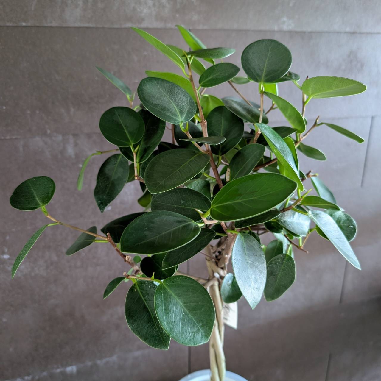 フィカスの仲間で丸く平たい大きな葉をつけるのが特徴です。