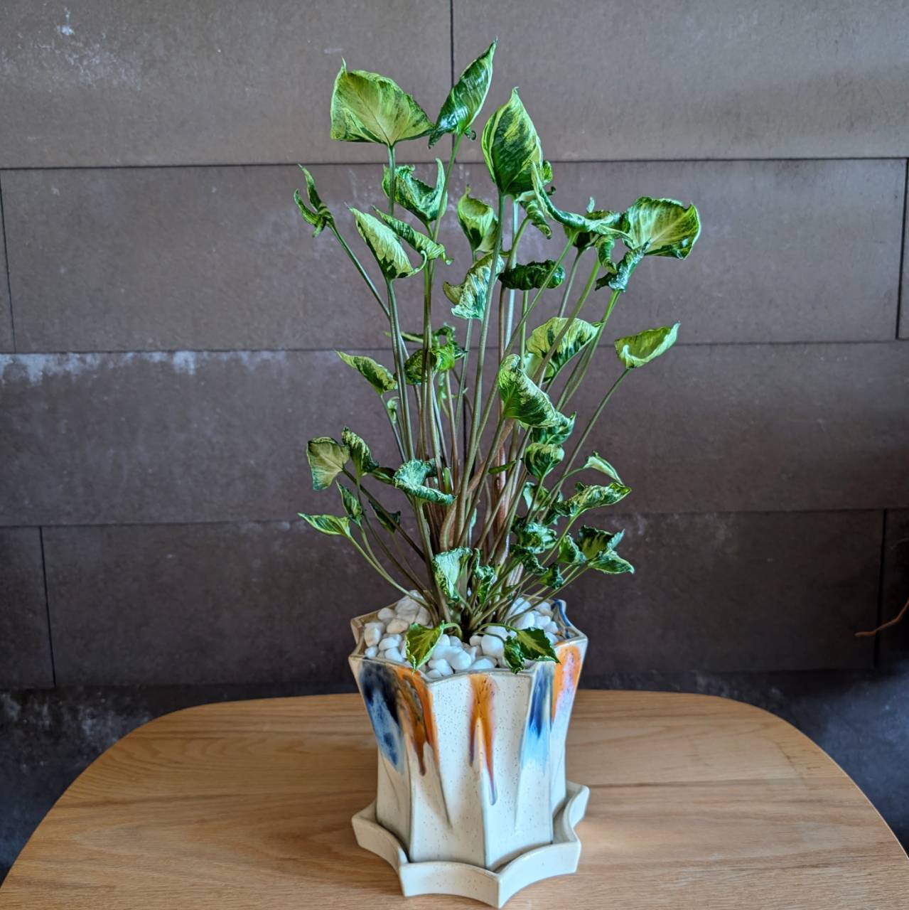 葉の中心には明るいグリーンの班が入り、動きのあるフォルムと相まって、空間にさりげないアクセントを添えてくれます。