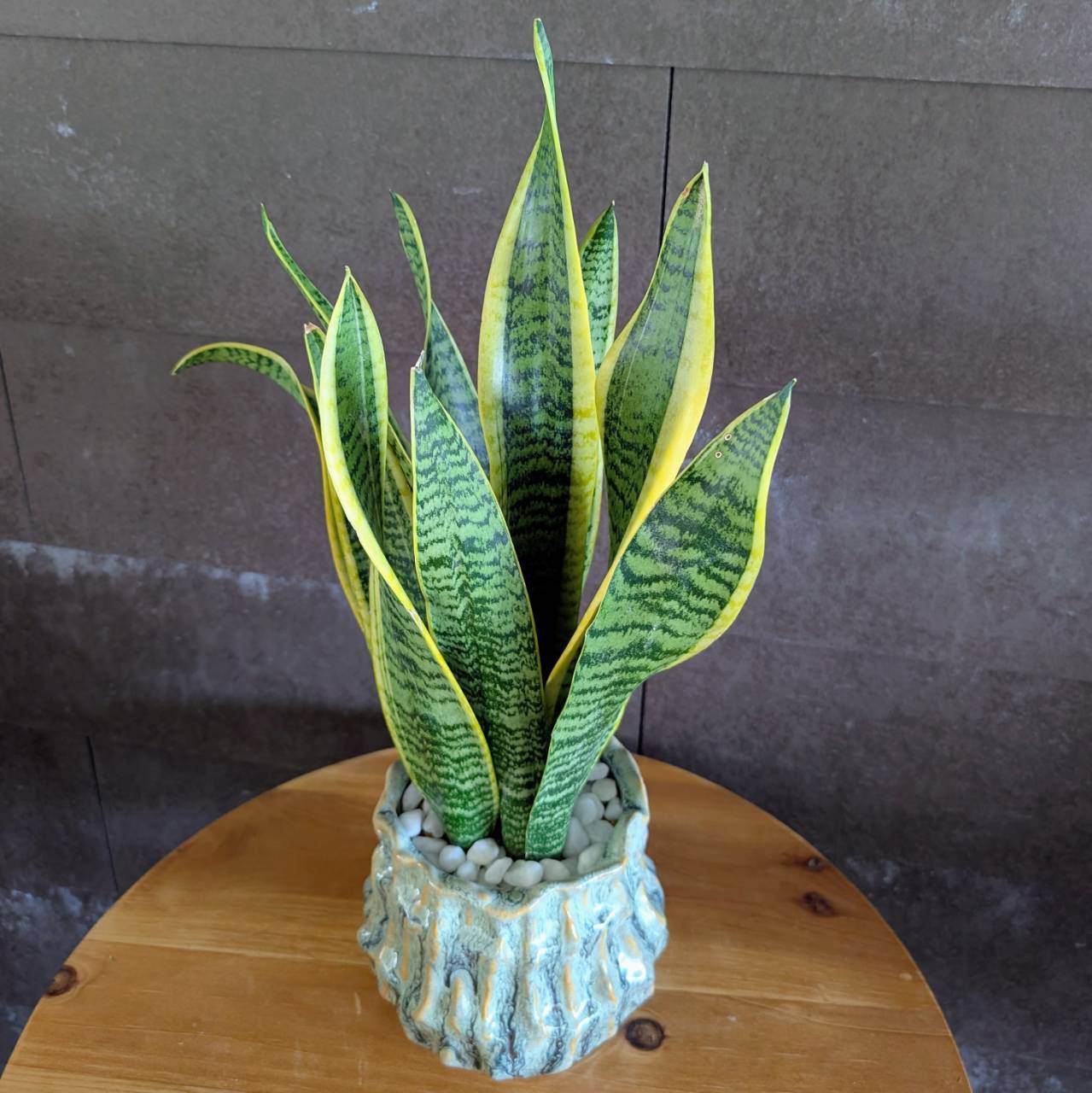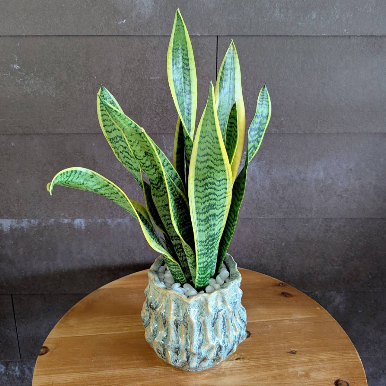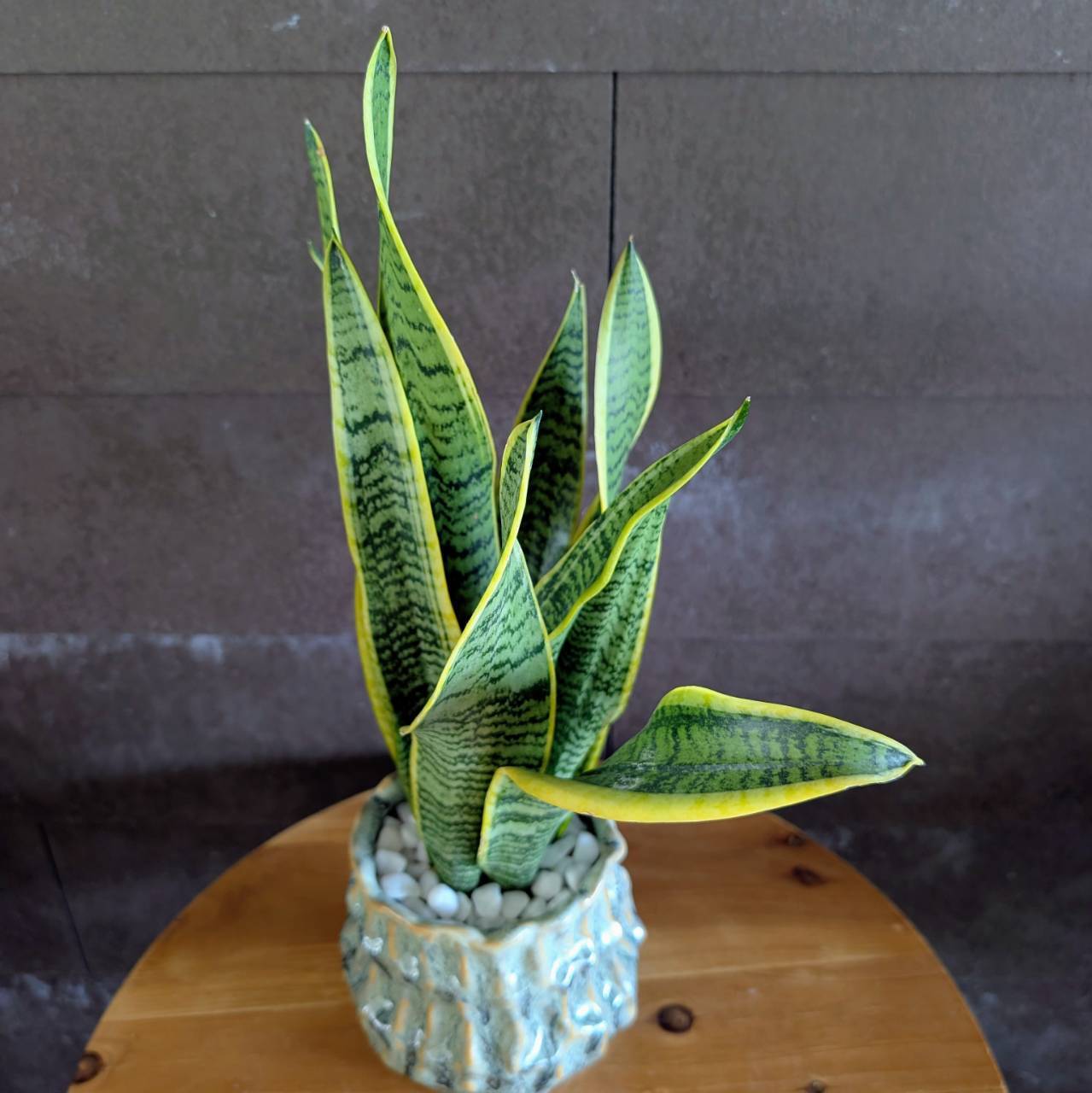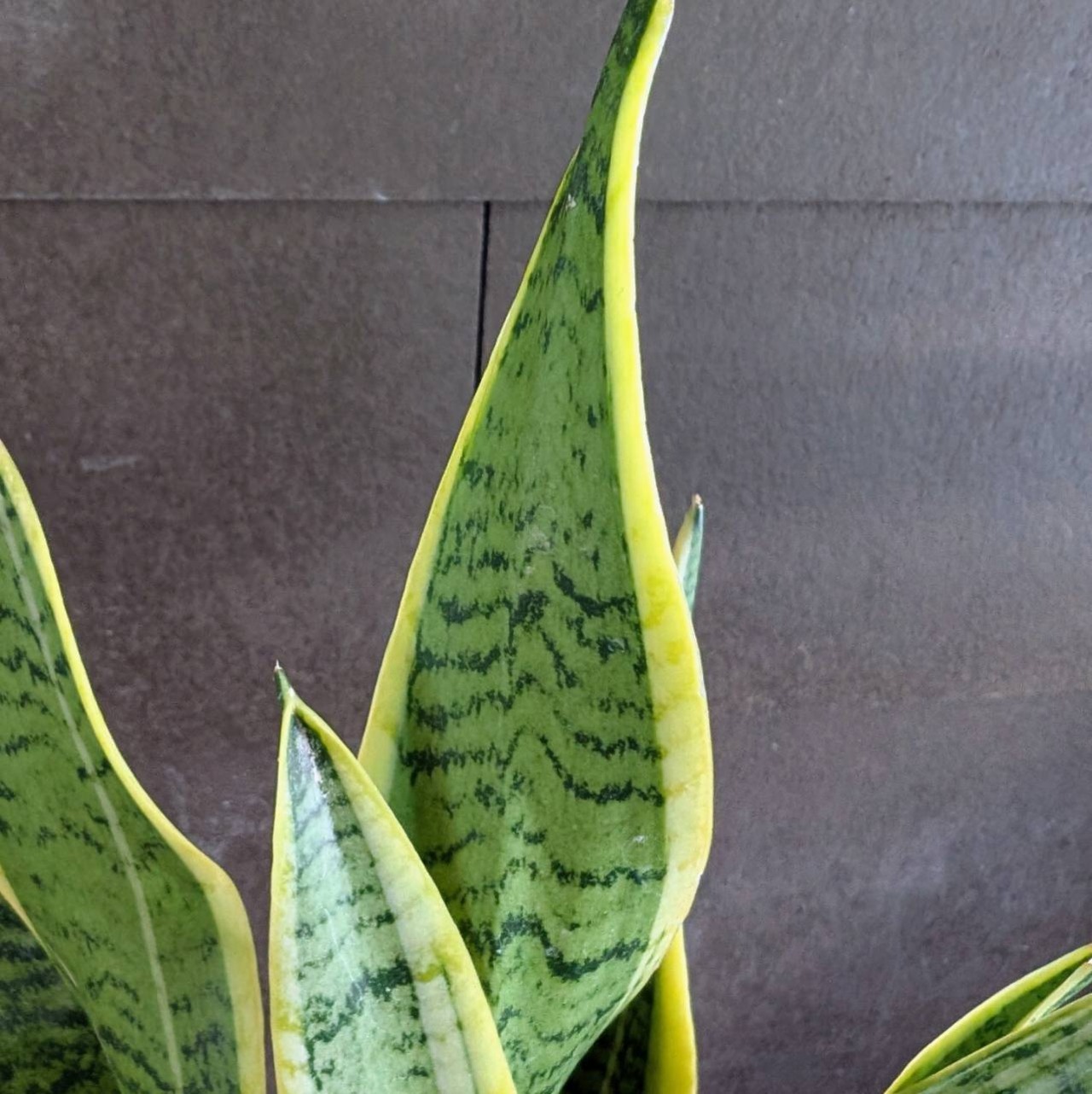 すっと上に伸びるシャープな葉と、緑に入るイエローラインが印象的なサンスベリア・ローレンチ。