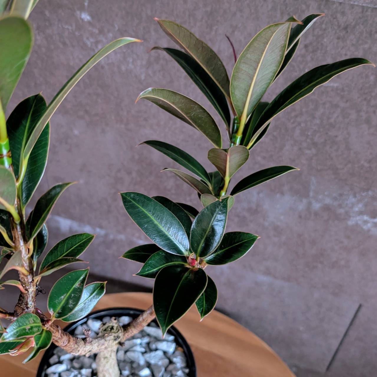 艶のある濃いグリーンの葉と、新芽の赤みが美しく映えるフィカス・メラニー。